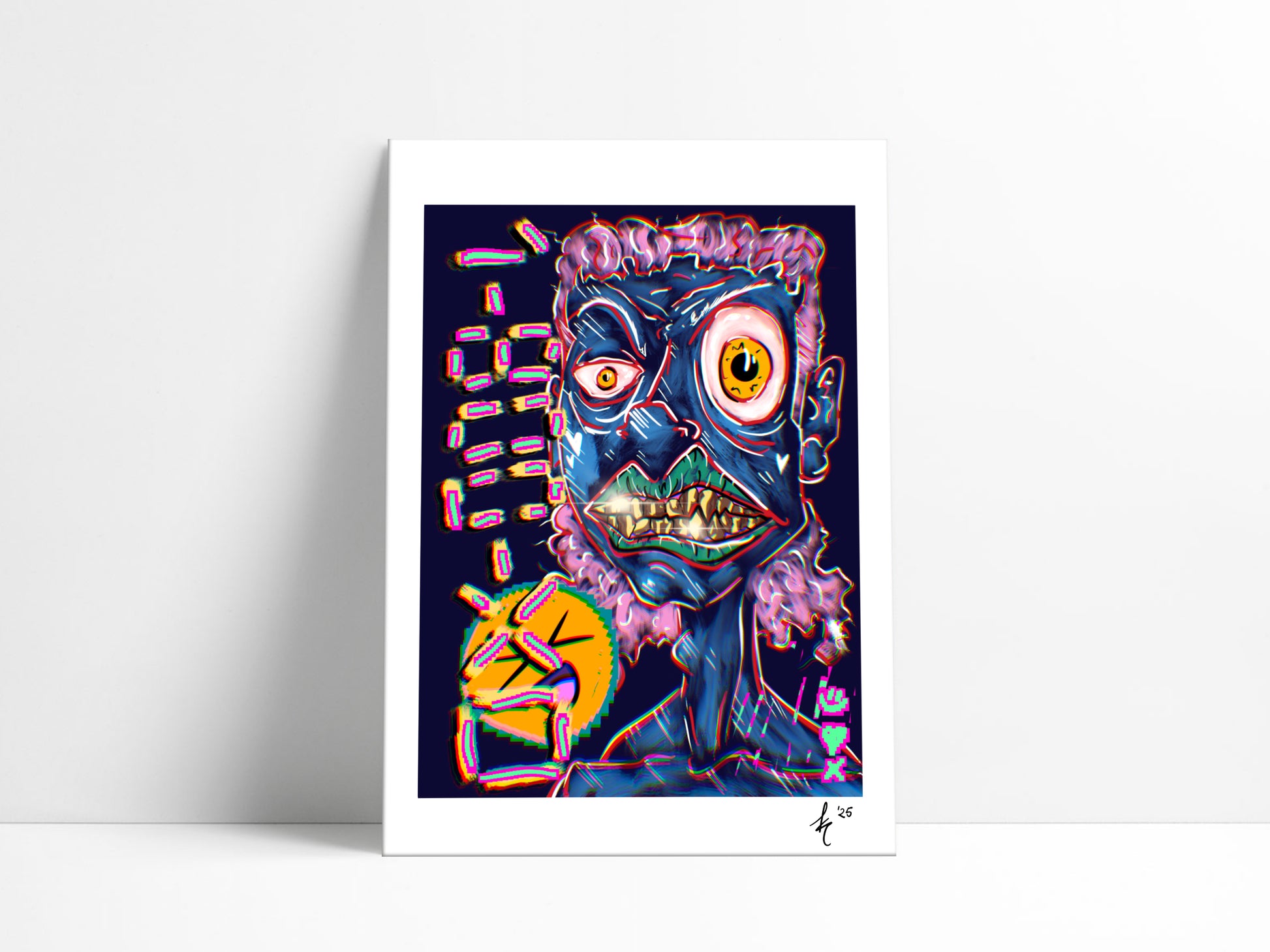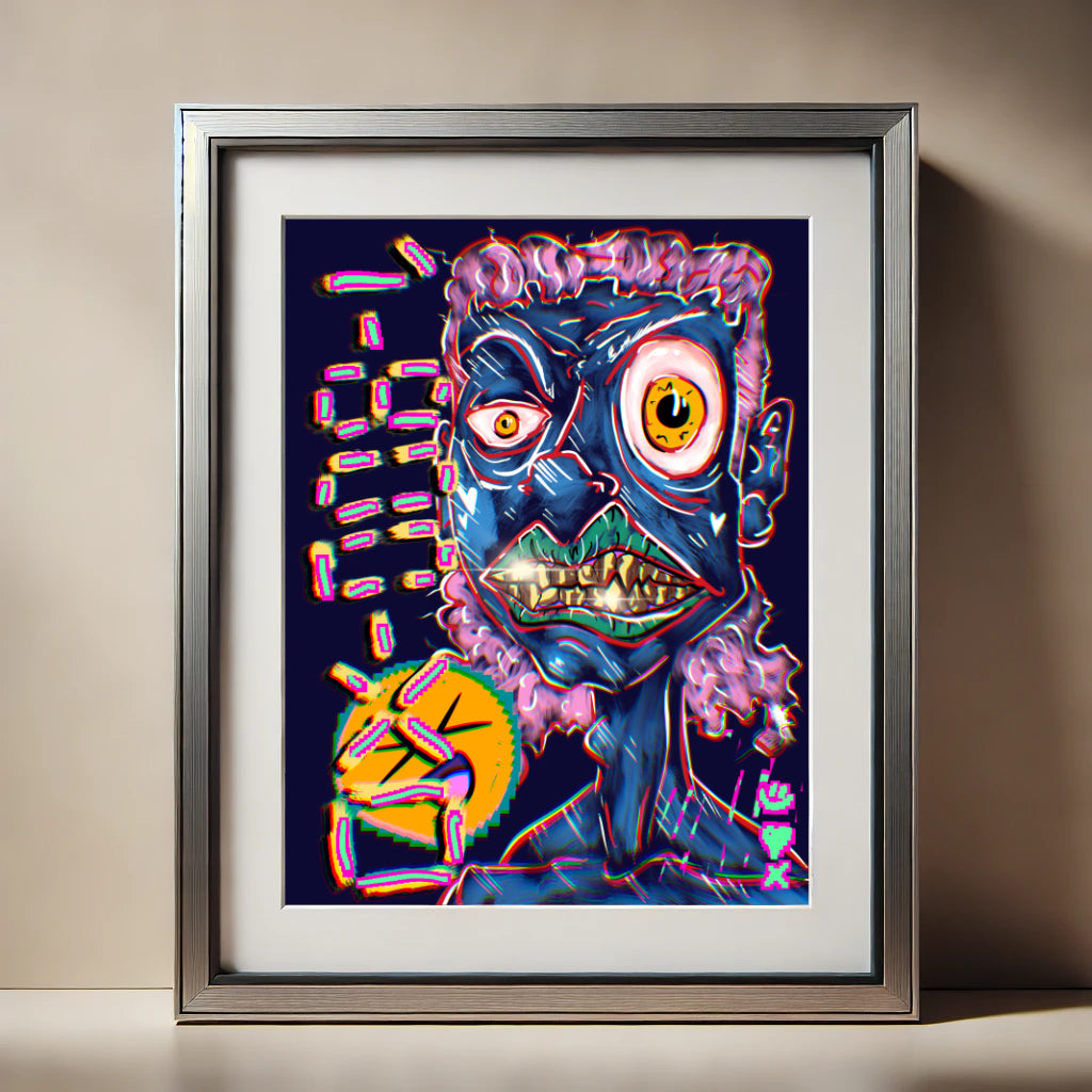 Mit greller Energie, golden Grillz und verzerrter Ästhetik stellt „1-800-XD“ eine groteske Karikatur moderner Hyperrealität dar – ein Gesicht, das zwischen Wahnsinn und Ironie oszilliert, eingefangen in einer neonfarbenen Glitch-Welt.