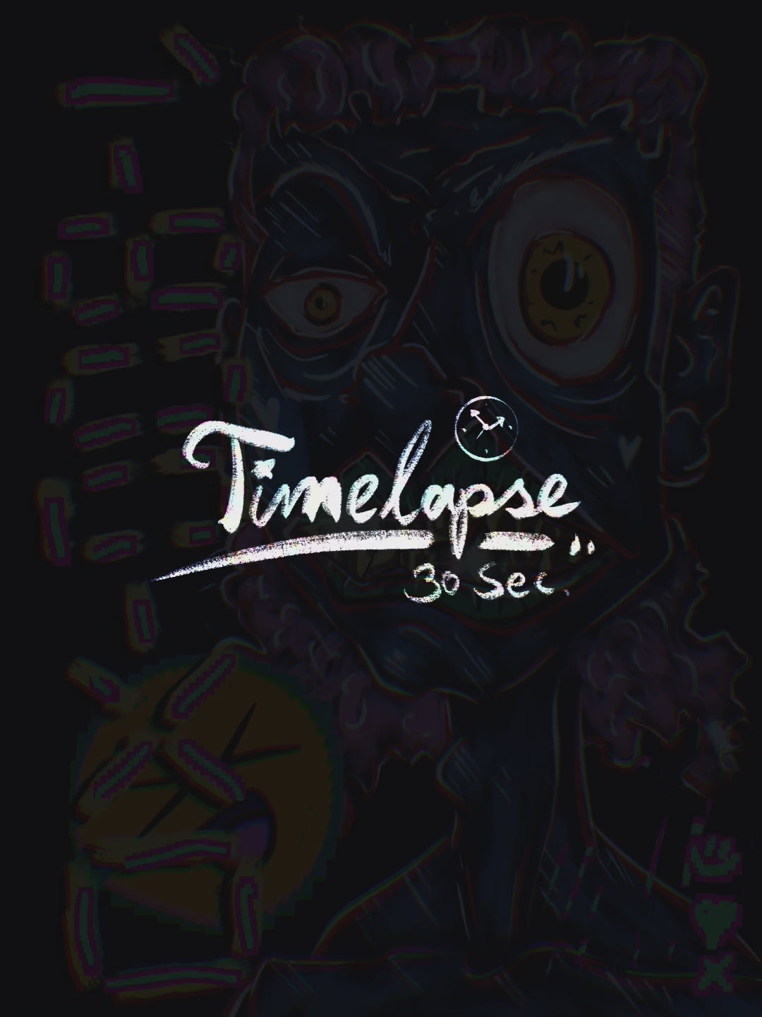 Das Werk vereint rohe, fast skizzenhafte Linienführung mit digitalen Effekten, die an fehlerhafte Übertragungen und visuelle Artefakte erinnern. Das zentrale Gesicht ist zugleich bedrohlich und komisch, grotesk verzerrt, mit übersteigerten Mimikzügen, die zwischen Schmerz und manischem Lachen schwanken.